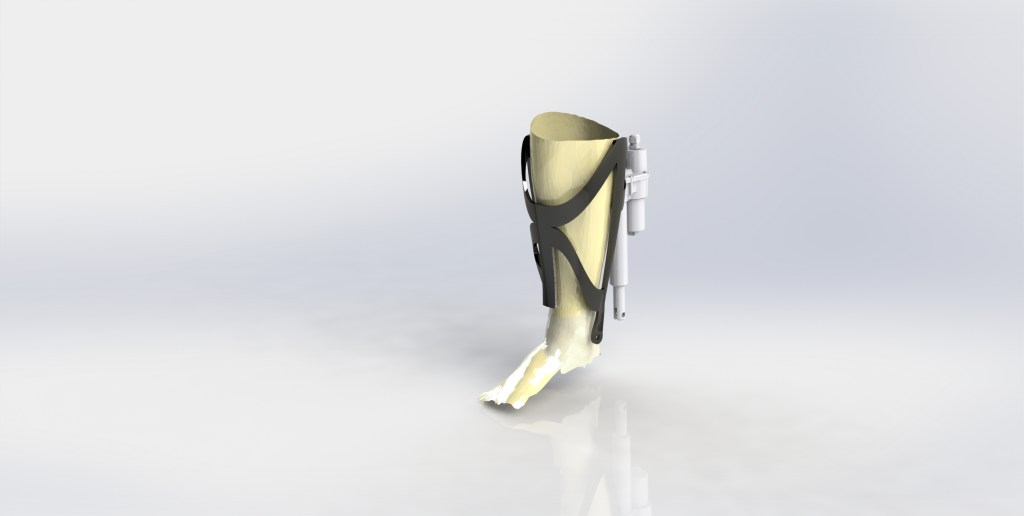 The initial device designed by ExO is a knee assistive device that employs an electronic linear actuator to provide a force at some moment arm to simulate torque generated at the knee. The frame utilizes a patient specific 3D printed frame made from a carbon particulate nylon material and was designed and parameterized to the user in CAD. The goal of the geometry was to be as lightweight as possible while still being ergonomic to the user as well as sufficiently structural to handle all provided loads. The geometry was analyzed using FEA to simulate the stresses and deflections under highest possible load and under life cycle conditions.